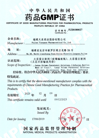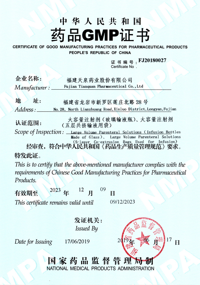 大容量注射劑(玻璃輸液瓶、五層共擠輸液用袋 )GMP證書
